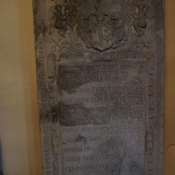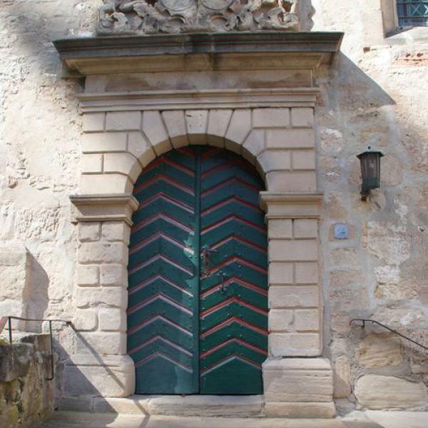 Der Schlussstein im Gewölbe über dem Altar trägt daher auch die Initialen des Landgrafen: LC 1699 Cuius nomen sit in benedictione (sein Name sei gesegnet/ gepriesen). Auch das Wappen über dem Eingangsportal weist auf den Landgrafen und dessen Ehefrau Anna Amalia hin.