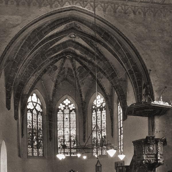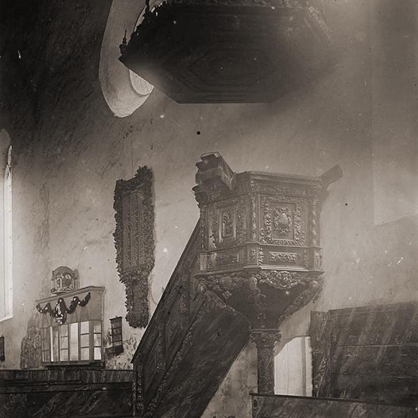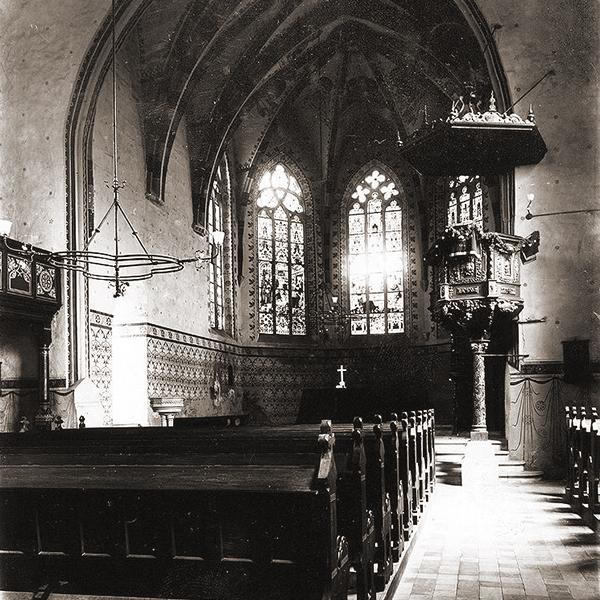 Zwei Fotografiendes 19. Jahrhundert vermögen die Ausgestaltung des Kircheinnenraumes genauer zu skizzieren. So stellt die erste Fotografie, vermutlich aus den 1870 er Jahren, die Südwand desKirchenschiffes mit Kanzel und dazugehörigem Schalldeckel dar. Unterhalb der Kanzel verweist ein heller Ausgang auf den Aufstieg zur Außenkanzel. Ebenfalls erkennbar ist ein Rundfenster über der Kanzel, welches der Fassadenöffnung in der Wand 201 C2 zuzuordnen ist. Die nach Osten orientierten Bänke werden an der südlichen Seite von einer Reihe von Gestühlen ergänzt.Dazu heißt es in einer Kirchenbeschreibung von Hans Bürger: